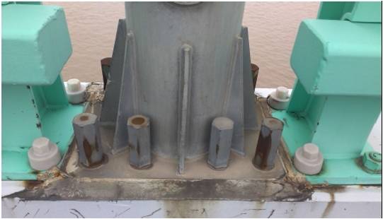 跨海大桥底座螺栓有护栏地脚螺栓、路灯柱螺栓及主航道桥护栏地脚螺栓三种类型。通常地脚螺栓采用了达克罗工艺进行防腐处理,而钢护栏立柱的螺栓外套为高强度PVC 螺栓螺母防护罩,内部灌注黄油,从而阻止空气和水分与螺栓螺母接触达到防腐蚀目的。原设计防护方式经过5年的实际应用,由于腐蚀性环境、恶劣气候等外部因素,大桥地脚螺栓出现?;ふ滞崖?、黄油液化流失,部分地脚螺栓出现锈蚀等现象。