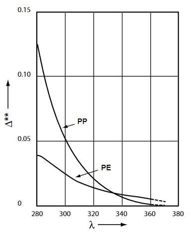 许多研究表明,一般而言,相同能量的短波紫外线比相同能量的长波紫外线的破坏力要强。例如,如图 2 所示,聚烯烃暴露在不同波长的 1MJ/m2 的紫外照射下,在 280nm形成的羰基是在 340nm的 5 到10 倍。类似的研究表明用焦耳数定义暴露时间将引起重大错误,除非相比较的光源的光谱功率分布完全相同。