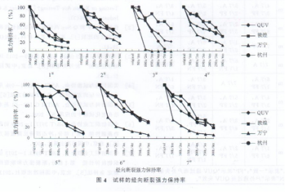 从以上数据可看到,不管是QUV加速老化试验还是户外暴晒试验,试样的强力下降都很明显。虽然这样是很难比较两者之间的相关性的,也很难对材料进行筛选。但是这也可能是一种有效的产品研发试验。