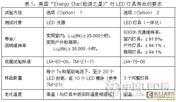 如表1所示,Energy Star将对LED灯具寿命的试验方法分为选项1和选项2,其中,选项1是通过测试光源推导灯具的寿命;而选项2仅适用于光源和灯具不可分的一体化灯具,直接测试灯具的光通维持率。选项1,L70(6k)的表示是指,利用6000h(6K)的老化测试推导出的流明维持寿命L70的时间。