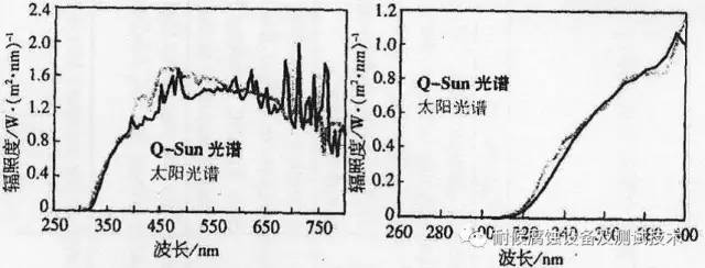 氙灯产生的光谱用于测试前必须经过过滤,减少不需要的部分紫外光谱。使用不同类型的玻璃滤光器可以得到不同的光谱。滤光器的使用取决于被测材料和产品最终使用条件。不同的过滤器过滤的紫外线的短波段的截止点不同,这将在很大程度上影响老化的速度和类型。有三类经常使用的滤光器:日光过滤器,窗玻璃过滤器,紫外延展过滤器。在纺织品测试中一般选择窗玻璃过滤器,下图1所示是Q-Lab公司配备有过滤器的Q-Sun氙灯日晒机的光谱与透过玻璃的太阳光光谱之间的比较。